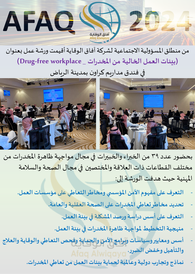 (بيئات العمل الخالية من المخدرات) من منطلق المسؤولية الاجتماعية لشركة آفاق الوقاية أقيمت ورشة عمل بعنوان (بيئات العمل الخالية من المخدرات) (Drug-free workplace) في فندق