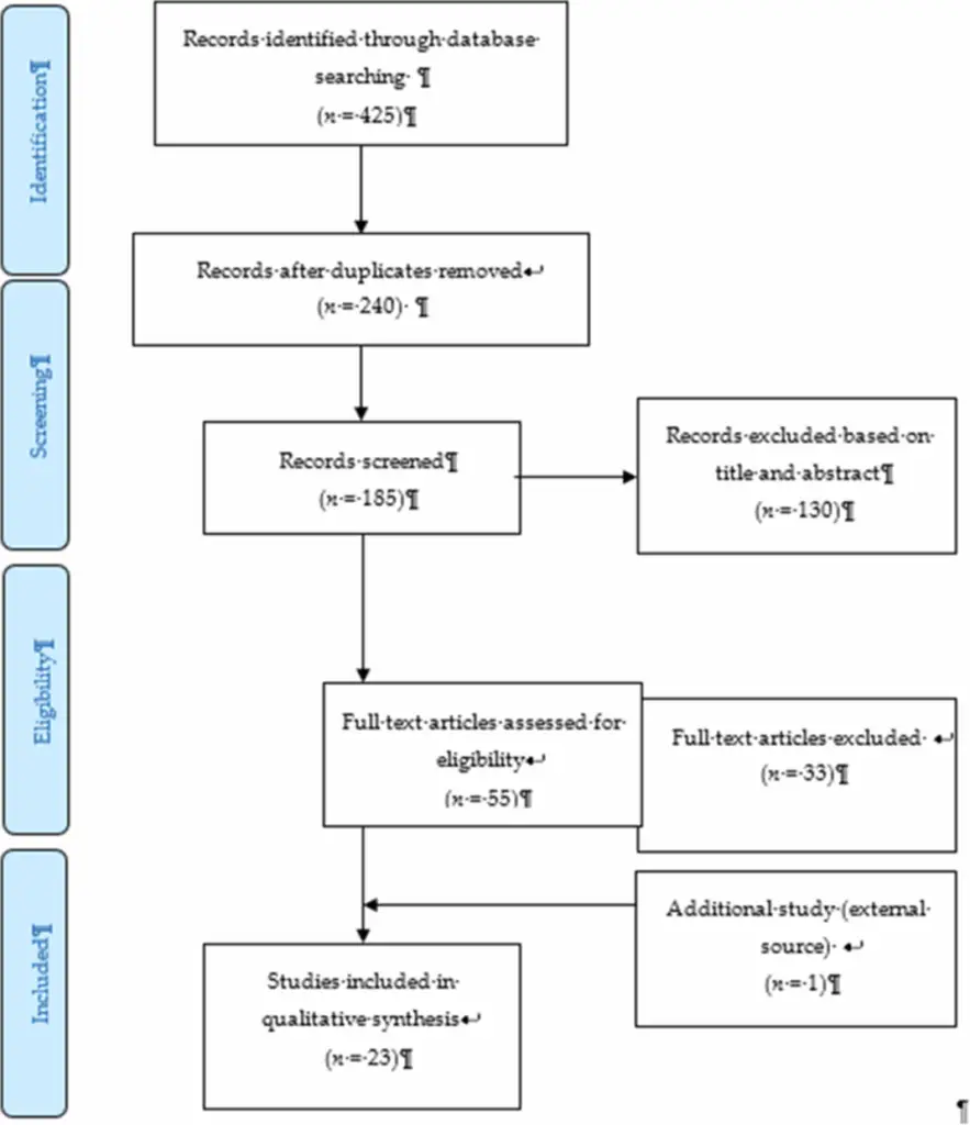 وجد البحث الأولي 425 دراسة للمراجعة، ولكن بعد إزالة التكرارات وتطبيق المعايير المذكورة أعلاه، قمنا بتضييق المجموعة إلى 22 مقالة، وكلها كمية في تصميم دراستها. تتضمن الدراسات ثلاث دراسات مستقبلية لمجموعة [ 24 ، 25 ، 26 ]، وتجربة مجتمعية واحدة [ 27 ]، ودراسة حالة وشاهد واحدة [ 28 ]، وتسع دراسات مقطعية [ 29 ، 30 ، 31، 32 ، 33 ، 34 ، 35 ، 36 ، 37 ، 38، 39، 40 ، 41 ، 42 ، 43 ، 44 ، 45 ] . بعد مناقشة متأنية، وافقت جميع لجان المراجعة على إضافة دراسة نوعية واحدة [ 46 ] للمساعدة في توفير المنطق للنتائج الكمية . تم اختيار الورقة البحثية النوعية لأنها ناقشت جميع المجالات تقريبًا المتعلقة بعوامل الخطر والحماية الموجودة في هذه المراجعة.