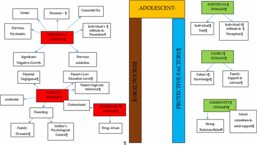 إن غياب عوامل الحماية ووجود عوامل خطر يُهيئ المراهقين لتعاطي المخدرات. من بين عوامل الخطر وجود مشاكل صحية نفسية وسلوكية مبكرة، وضغط الأقران، وضعف المدارس، والفقر، وضعف الرقابة الأبوية والعلاقات الأسرية، وضعف البنية الأسرية، وقلة الفرص، والعزلة، والجنس، وسهولة الحصول على المخدرات [ 9 ]. تشمل عوامل الحماية ارتفاع تقدير الذات، والتدين، والشجاعة، وعوامل الأقران، وضبط النفس، ومراقبة الوالدين، والكفاءة الأكاديمية، وسياسات مكافحة تعاطي المخدرات، والارتباط القوي بالجيران [ 10 ، 11 ، 12 ، 13 ، 14 ، 15 ].