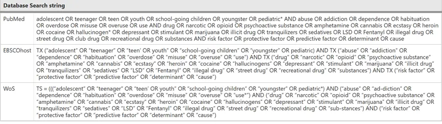 تشير المواد المتعلقة بالمخدرات في هذا السياق إلى المخدرات، والأفيونيات، والمواد المؤثرة على العقل، والأمفيتامينات، والقنب الهندي، والإكستاسي، والهيروين، والكوكايين، والمهلوسات، والمثبطات، والمنشطات. أما المخدرات التي يُساء استخدامها، فقد تكون إما أدوية غير مصرح بها أو أدوية موصوفة طبيًا. أما المادتان الأكثر شيوعًا في إساءة الاستخدام، واللتان لم تُدرجا في هذه المراجعة، فهما النيكوتين (التبغ) والكحول. وبناءً على ذلك، لم تُدرج السجائر الإلكترونية ولا السيجارة الإلكترونية المحتوية على النيكوتين. علاوة على ذلك، يشير مصطلح “المراهقة” في هذه الدراسة إلى أفراد الفئة العمرية من 10 إلى 18 عامًا [ 21 ].